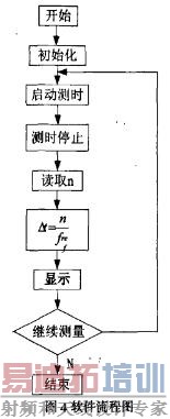 系统软件包括对各工作电路的初始化设置,根据分频计数电路得到的n 值,计算时间间隔时间间隔Δt,送给显示电路显示。流程图如图4 所示。
