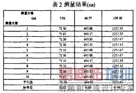 由关系式(2)可知,对已知材料的电缆,电缆长度L与发射脉冲与反射脉冲间时间间隔Δt 成正比。通过对已知长度的电缆发射脉冲与反射脉冲的时间间隔进行测量,可以对时间间隔测量模块的特性进行验证。本文对长7.01m,66.77m 和120.30m 的电缆分别进行多次测量, 测量结果如表2 所示。