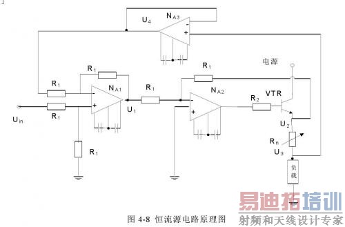 恒流源的工作原理如下:基准源Uin分压后,经过加法器NA1、反馈放大器NA2,由电流放大驱动VTR电路输出电流Ix.为了使输出电流稳定,除各个环节引入深度负反馈外,还从输出电流Ix取样经电压跟随器NA3反馈至加法器NA1,形成一个大反馈,进一步增强了输出电流的稳定度,使恒流源在负载变化较大范围内输出电流具有高稳定度。