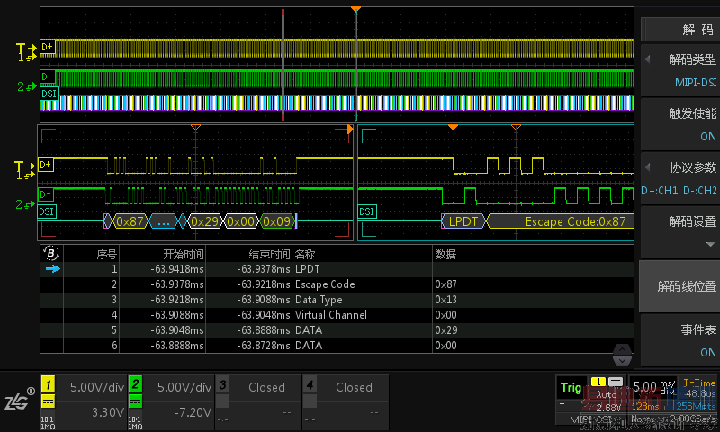 (2) ZDS4054 Plus标配512Mpts的存储深度,且可对全内存数据进行解码,MIPI-DSI协议解码界面如图8所示。可通过事件表查看具体的解码内容,也可以将事件表中的内容通过导出报表的格式将其导出。