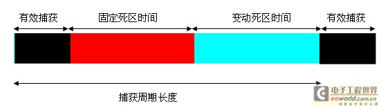 图上为一个波形捕获周期的示意图。捕获周期长度由有效捕获时间和死区时间组成。在有效捕获时间内,数字示波器按照用户设定的采样率进行捕获,并将其写入RAM中。死区时间可分为固定死区时间和变动死区时间两部分。固定死区时间具体取决于当前数字示波器自身的情况,如FPGA/DSP等芯片的计算速率以及算法构架等。变动死区时间则取决于处理ADC采集到的数据所需的时间,它与设定的存储深度(记录长度)、时基、采样率以及所选后处理功能(例如,插值、数学函数、测量和分析)多少都有直接关系,所以这部分的死区时间是变动的。