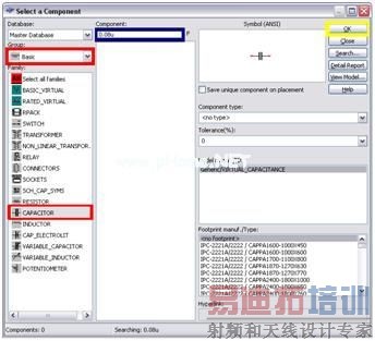 12. 在“选择部件”对话框中,对应红圈内参数进行设置。图示为选择基本组和电容类(图4)。
