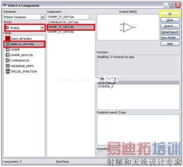 3. 在“部件区域”中,选择OPAMP_3T_VIRTUAL(红圈)。