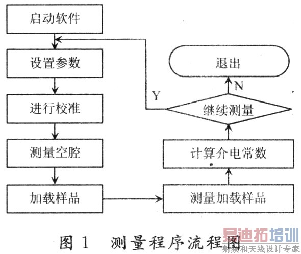 首先,对测试系统进行参数设置,主要包括测量频段的选定、测量点数的设定、通道的选择等。然后,通过GPIB-USB卡控制矢网测出空腔状态下的谐振频率f0和品质因素Q0,再加入样品,测试负载时的谐振频率fd和Qd,再利用这两组数据,根据计算公式和样品尺寸及腔体尺寸计算出相对介电常数和损耗正切角。