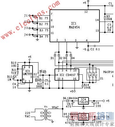 电路原理见图2。电路的核心是一块视频切换电路MAX454(见图3)。它具有质量良好的输出图像和很低的相位失真特点。电路内部包含4路视频输入(IN0~IN3)和一个低输入阻抗的线路放大、驱动器,两个地址输入(A0、A1),一个视频输出和两个电源端子。监控镜头通过J1-J4与切换器视频输入端相联。75Ω电阻构成输入的终端电阻。内部放大器的增益由接在IC1的13脚的反馈网络设置。反馈网络由R5-R8和C3构成。其增益设置为2是为了补偿在终端电阻R9(75Ω)上的消耗。最后在输出端J5的增益为1。