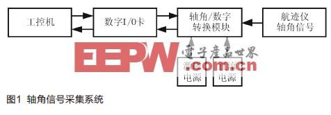 为了保证系统的通用性和可扩展性,采用基于虚拟仪器技术的测试平台。考虑到体积、重量等因素,采用固态技术,而不使用机械式旋转变压器。为了提高开发速度,轴角转换模块的控制采用数字I/O卡,避免基于PCI总线板卡的软硬件设计。仿真运行与测试平台构建航迹仪所需的工作环境,并对航迹仪各旋转变压器解算输出进行检测。整个仿真运行与测试平台由硬件系统和软件系统两大部分组成。轴角信号的采集基于航迹仪仿真运行与测试平台,其系统组成如图1所示。图中,轴角/数字转换模块用于将旋转变压器输出的模拟角度信号转换成与TTL电平兼容的并行自然二进制码数字量[1,2],其工作所需的激磁和工作电源分别由激磁电源和直流电源提供。