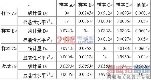 从表1中可知,在取统计距离D=0.0601,显著性水平 =0.05为门槛值,则识别的结果完全正确。