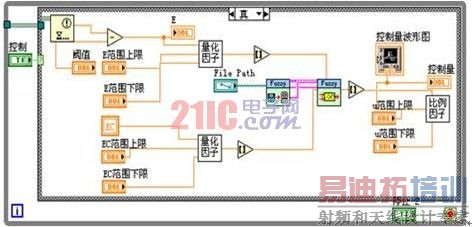 模糊控制模块设计采用NI公司的LabVIEW PID 工具包,模糊控制算法直接在Labview软件内实现,采用查表法,使模糊控制器可以保证控制的实时性。控制过程是:切削过程中的各类加工信号通过NI PCI-6220采集卡以数字信号的形式被采进主控计算机后,并对其进行预处理求其特征值,在主控计算机的Labview环境中,与设定的标准值比较后求 出误差和误差的变化,通过查询事先做好的模糊控制表,得到一个模糊控制的输出量,再通过NI PCI-6220的一个数字输出口,从而控制MQL系统。图7为模糊控制的核心程序框图。