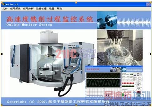该系统主要由数据采集卡PCI-6220通过各个传感器分别采集到高速干切削加工过程中的振动信号、温度和功率信号,将采集到的信号反馈到主控计算 机,由预先编制好的虚拟仪器(LabVIEW)程序进行实时数据处理提取其特征值并存储,通过LabVIEW程序中的模糊控制模块间接控制MQL系统以实 现冷却润滑物喷射到干切削工作台的流速大小,从而完成整套闭环系统。系统运行现场参见图2: