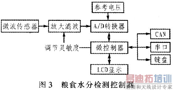 粮食水分检测控制器是硬件设计的核心部分,它由放大滤波电路、A/D转换、微控制器、键盘、LCD显示和串行总线接口组成,如图3所示。微波传感器探头拾取的微波电信号,经过放大、滤波处理后,再进行A/D转换,粮食水分推算结果在LCD上进行实时显示。键盘接口可以进行控制器参数设置、水分标定等操作。通过串口与计算机进行数据通讯,CAN总线为多个控制器的级联接口。