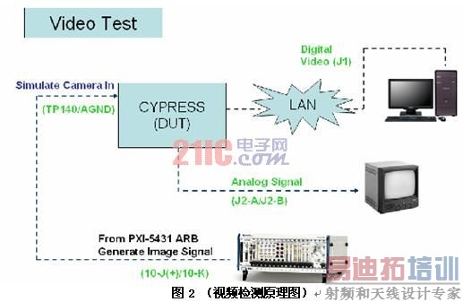 PXI-5431高精度模拟视频信号发生器,可以模拟视频信号源输出到待测PCB板的视频编解码芯片,在通过网络将数字视频传输画面到计算机,从而实现对视频编解码芯片的测试。一个简单的视频信号测试原理如图2所示。