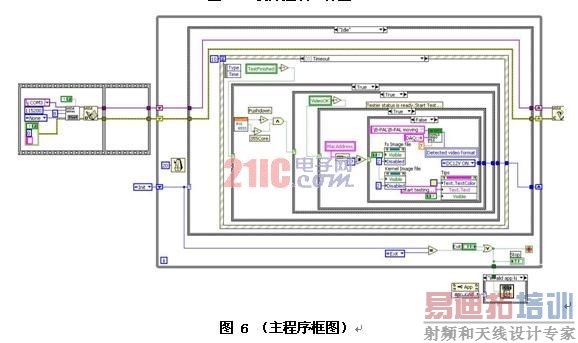 整个软件程序框架采用了事件+状态机的结构,状态机是LabVIEW程序中最常用的设计模式之一,它由一个主循环和一个Case结构组成,利用移位寄存器实现状态跳转,在编程中我们利用了Typedef来实现状态枚举值,构建了模板,这样可以很方便的添加减少状态值。同时在状态机的Idle状态中加入事件结构,当每次状态完成,跳转到Idle状态都会实时响应操作员的界面操作,程序框图如图6所示。