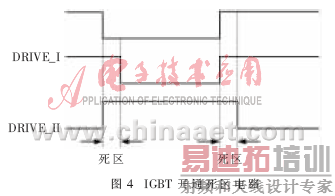 IGBT开通死区电路的作用是在IGBT双向开关I、II的开通和关断动作之间造成死区,防止2个IGBT双向开关同时导通造成调压器的原、副边短路,如图4所示。IGBT双向开关I、II的开通死区时间可以通过改变死区电路中的电阻值或者电容值来调节。电压跌落与恢复指令信号DIP既可来自DSP,也可以来自手动开关。