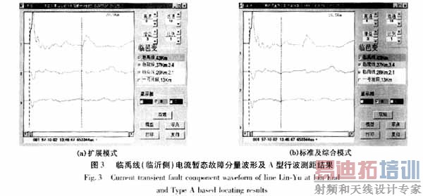1997年10月2日13时46分47秒,山东德州电业局所管辖的110 kV临禹线(全长43 km)发生B相接地故障,其中临邑侧含故障线路在内同母线上3条线路的故障相电流暂态故障分量波形如图3所示,可见该波形较为复杂。仔细分析可以发现,在故障距离为26.9 km处存在由来自故障方向行波浪涌引起的波头分量,其初始极性与故障初始波头分量的极性相反,但二者很快变为同极性,因而必为线路对端母线反射波所引起,而且对端母线必为第2类母线,从而可以直接获得扩展模式下的测距结果为26.9 km,如图3(a)所示。标准和综合模式下的测距结果可以间接获得,并且近似为(km)。从故障线路电流暂态分量波形中可以发现,在对应于该近似位置的邻域内距离本端16.5 km处存在由来自故障方向行波浪涌所引起的暂态波头分量,如图3(b)所示,从而可以将标准和综合模式下的测距结果修正为16.5 km。实际故障点位于距本端16 km处(线路中点以内)。