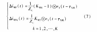 假定M端电流正方向为母线到线路方向,则线路MN故障产生的初始行波浪涌到达本端时所引起的本线路电流暂态故障分量可以表示为:
