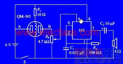 当周围空气中有瓦斯气体时,气敏元件的电阻迅速减小,555集成电路4脚变为高电平,振荡器电路起振,扬声器发出报警声,提醒人们采取相应的措施,以防事故的发生。