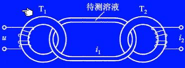 用被测溶液构成一个短路线圈,将两个变压器T1和T2耦合起来。T1为激励变压器,其初级通以交流电压时,通过对i2的测量可以得到溶液的电导,从而得出相应的浓度。