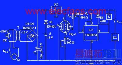当HQ—1气敏元件检测到有害气体浓度超过安全值时,电路发出报警,同时开启排气扇。