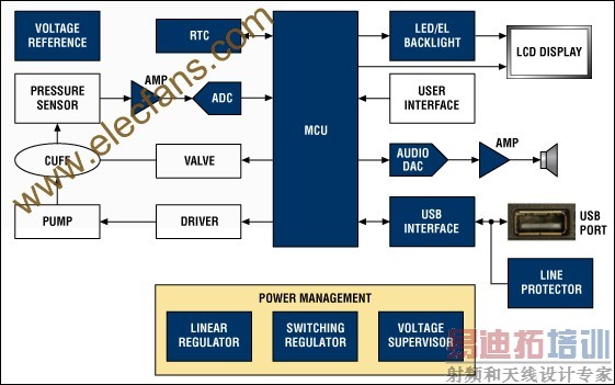 压力传感器产生的信号经过运算放大器或仪表放大器调理后送入模/数转换器(ADC)。然后,针对不同类型的监视器和传感器,采用适当的方法在数字域计算心脏收缩压、舒张压和脉搏速率,并将得到的结果显示在液晶屏(LCD)上,通常还会将数据和对应的时间/日期存储到非易失存储器内。