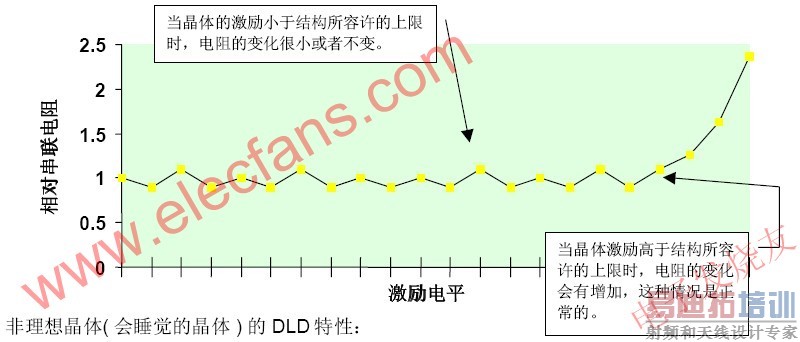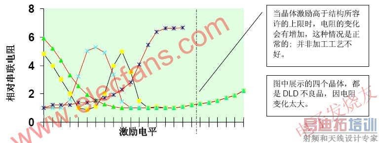 就算是激励电平低于结构所容许的激励上限,由于生产过程中各种不同污染的影响,使得非理想晶体的电阻和频率变化较大(电阻变化几倍,频率变化几十个PPm)}