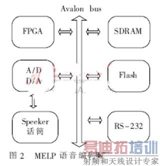 为便于程序的调试,扩充了RS-232串口,可与计算机串口直接互联。8 MB容量的SDRAM可为Nios II软核处理器运行嵌入式操作系统提供所需的存储空间,2 MB容量的Flash也可为MELP的软件编制提供存储空间。WM8731音频芯片提供快速的音频编解码数据码流,并向扬声器传输解码后的数据流。