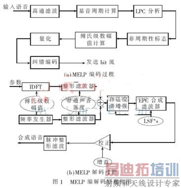 MELP声码器是建立在传统的二元激励LPC模型基础上,采用了混合激励、非周期脉冲、自适应谱增强、脉冲整形滤波和傅氏级数幅度值等5项新技术,使得合成语音能更好地拟合自然语音。图1所示为MELP编解码原理框图[2]。