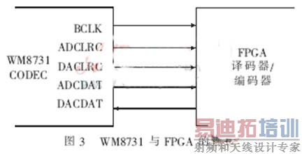 各芯片之间的互联通过引线连接到FPGA的IO脚。Nios II处理器的内部总线通过定义引脚连到IO,这样需要连接到Avavon总线的芯片可通过IO脚连到总线上。图3所示为WM8731CODEC芯片与主芯片FPGA的连接。