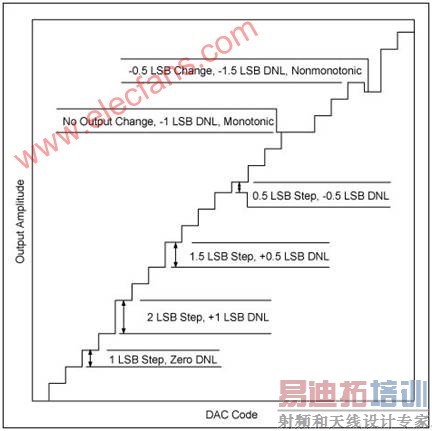 DNL定义理解起来要难一些,确定最低有效位(LSB)的权值会影响DNL。DAC中需要考虑DNL没有小于-1 LSB的编码。小于这一电平的DNL误差表明器件是非单调的。当输出不随输入码增大而减小时,或者输出不随输入码减小而增大时,DAC是单调的。图2解释了正、负DNL误差,澄清了单调的概念。
