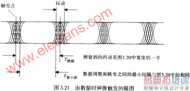 有人会问道:“为什么不能用图3.20中的技术,然后把结果除以2呢?”回答是:只有当图3.20的眼图张得足够大时,抖动的测量才得以进行,而我们并不总是这样幸运。有时,如果我们不采用图3.21所示的高级触发技术,眼图根本就无法张开。