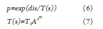 在每一轮进化完成后都需要决定进入下一轮进化的种群。如果过多地将较优种群作为父代,就会使算法过早收敛或搜索缓慢。文献[7]中指出模拟退火算法能够以一定的概率接受劣解从而跳出局部极值区域并最终趋于全局最优解,因此可以将上文提到的最优适应度增幅比作为能量函数,运用模拟退火的Meteopolis准则来选择待进化的种群。为了使每个种群得到充分地进化,预防最优解的丢失,这里采用设置退火步长的策略来实现模拟退火选群。该策略具体为:使退火步长对同一种群作为父代的次数进行计数,一旦产生更优种群则退火步长就置零并重新计数。若退火步长累计超过一定的阈值时,就进入模拟退火选群阶段。退火步长累计到一定数量意味着原有种群的进化已经停滞,需要用模拟退火算法摆脱这种停滞状态。如果增幅比大于零,则说明新生种群优于原有种群,这时完全接受新种群进入下一轮进化;否则新生种群劣于原有种群,并以一定的概率p接受较劣的新生种群[8]进入下一轮进化。接受概率p由式(6)和式(7)共同决定,其中dis为增幅比,T(s)指温度参数,T0和s分别是初始温度和迭代次数。