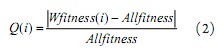 独立敏感度信息量Q(i)指的是对在所有特征都被选中时计算所得到的适应度值Allfitness以及只有特征i未被选中时计算得到的适应度值Wfitness(i)按式(2)进行计算得到的数值。独立敏感度信息量刻画了适应度对特征i是否被选择的敏感程度。