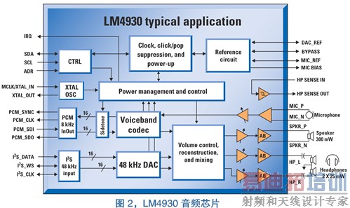 LM4930 芯片的输入端 (左边) 设有两个接口。其中一个是 I2S 输入接口,负责为 MP3 播放、FM 广播及复音振铃等内容提供经过应用程序处理器处理、并适用于整个频率范围的数字音频信号。另一接口是连接通信引擎的双向 PCM 接口,专门负责传送语音信号。