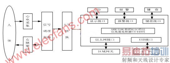 心血管疾病是目前对人类危害最大的一种疾病,而心电图是检查、诊断和预防该类疾病的主要手段和依据。由于传统的基于PC机平台的心电监护仪,价格昂贵,体积庞大,不便于移动且主要集中在大医院,而无法实时监护患者的病情,给医生和病人带来了很大的不便。近年来,随着嵌入式和网络通讯技术的飞速发展,我们研制出一种基于ARM7处理器的新型嵌入式心电监护仪,它采用Samsung公司的一款ARM7TDMI核的RISC的32位高速处理器S3C44B0X,具有成本低、体积小、可靠性高、操作简单等优点,适用于个人、中小医院和社区医疗单位,为家庭保健(HHC)和远程医疗(Telemedicine)等新兴的医疗途径提供良好的帮助与支持。