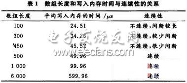 数据写入内存的时间与主控计算机运行速度以及数组的大小有关。表1所示的是数组长度和写入内存的时间与输出数据连续性之间关系的实验结果。其中,平均写入内存时间指的是同一个数组循环执行写入操作10万次得到的平均结果。输出FPGA的速率为10 MHz。