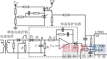 图1中虚线框外的电路是普通的峰值电流方式的PWM控制电路,利用电流互感器取样峰值电流。图中所示的PWM芯片是ST公司生产的L5991。虚线框内是本文所提出的限流保护电路。它利用峰值电流控制中的电流信号作为输入信号,通过一个由D1, R 1, C 1组成的峰值保持电路和由运放组成的PI环节得到一个误差信号,在变换器的输出电流超过限定值的时候,该误差信号就会控制PWM芯片的占空比,从而使输出电流保持在限定值。由于D2存在,当输出电流低于限流值时,该部分电路对占空比的控制不起作用。