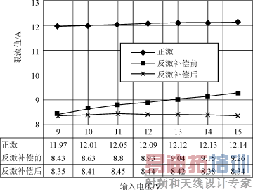 图10则给出了正激,反激补偿前和反激补偿后实测限流值随输入电压变化的曲线。正激变换器限流值随着输入电压变化基本不变,而反激变换器限流值在补偿前随输入电压的变化有较大的波动。但是,在加了补偿电路之后反激变换器限流值的稳定性有了明显的改善,证明了该补偿电路的有效性。