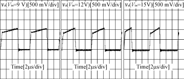 图8及图9分别给出了输入电压分别为9V,12V,15V,电路满载工作时正激变换器和反激变换器限流保护电路 v a的波形,与图5和图6的理论波形也是一致的。