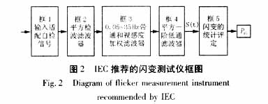 闪变是由于电网电压的波动,所引起的灯光闪烁对人眼视觉产生刺激的响应。它不仅和电压波动大小有关,而且和波动的频率(即对工频电压的调幅频率)、照明灯具的性能及人的视感因素有关。因此,要获得闪变值,就必须在取得电压波动信号mcos(Ωt)的基础上,根据人眼视感度曲线进行相应的处理。国际电工委员会(IEC)依据1982年国际电热协会(UIE)的推荐,给出了检测电压闪变的设计规范,其框图如图2所示。