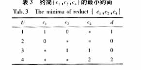 (1) 删除条件属性集合的冗余属性,找到所有约简。首先定义决策规则的协调性:相同的规则前代(即属性部)必然有相同的后继(即结论部);不同的规则前代允许有不同或者相同的后继;相同的后继允许相同或不同的前代。判断某一个条件属性冗余或可省的准则是:若去掉条件属性集中某属性后,算法中所有规则仍然协调,则该属性冗余而可省去;若有一个规则不协调,则该属性不可省。同理,依次单独去掉其他条件属性来考察规则的协调与否,去掉所有冗余条件属性。例如逐一除去表1中条件属性c1,c2,c3,c4,看看没有该列决策表是否协调。检查后发现c3是多余的,而c1,c2,c4是必需的属性。{c1,c2,c4}称为原条件属性集{c1,c2,c3,c4}的一约简。一个决策表的条件属性集可能存在多个约简。本例中只有一个,见表2。
