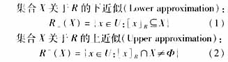 其中x为U中的一个对象,[x]R表示所有与x不可分辨的对象组成的集合,即由x决定的等价类。实际上R_(X)是U中包含在X中的最大可定义集,R-(X)是U中包含在X中的最小可定义集。
