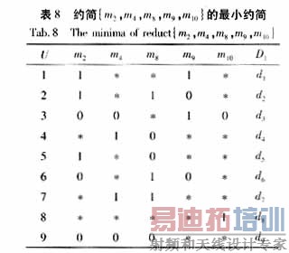 中约简{m2,m4,m8,m9,m10}如表7所示。这11个约简保持了与原决策表完全相同的分类能力,但所需的条件属性却大大减少,对以上11个约简进一步消去每一决策规则的冗余属性,可得最小约简,其中约简{m2,m4,m8,m9,m10}的最小约简如表8所示。决策表的最小约简清晰地显示了每个故障的重要特征,它们具有与原决策表相同的诊断能力。
