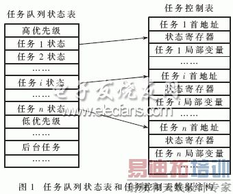 系统上电,初始化每个任务的固定任务栈,建立任务队列状态表和任务控制表(TCB),这两张表是任务调度的依据。任务队列状态表由高优先级、低优先级、后台任务三张子表组成;任务控制表由任务首地址、状态寄存器、任务局部变量三部分组成,数据结构见图1。