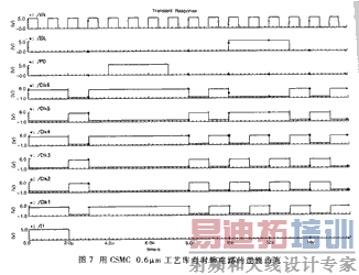 综合图3、图4、图6就构成了整个时钟系统。为了对电路进行逻辑仿真,首先在CADENCE的Composer-schematic中调用CSMC 0.6μm标准单元工艺库,设置好管子参数,画出电路图。然后进入Analog Artist Simulation环境进行参数较理想化的电路仿真。其中clk的脉宽为0.5μs,周期为1μs,将各种信号(如PD、IDL)的上升时间和下降时间设置为0.002μs,整个仿真时间取16μs,参考电压为5V,得到的仿真结果如图7所示。可以看到I1=1时,通往内部的各时钟信号被封锁;PD=1时,所有时钟(Clk1~Clk6)被冻结;而IDL=1时,只有通往CPU的Clk5和Clk6被冻结,,因此各信号满足设计要求。