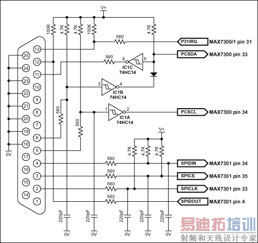 该程序利用八根并口打印输出线中的三根,模拟SPI串行接口,另外两根输出线用来模拟I²C串行总线。并口控制输入线用于读取SPI数据、Isup2;C数据和中断状态。可以同时对多片MAX7301 (多达16片,菊花链连接)和/或多片MAX7300 (多达16个,配置为不同的Isup2;C地址)进行操作。软件可以选择LPT1或LPT2端口。该端口可以为标准方式、ECP或EPP方式。并口连接如图1所示。