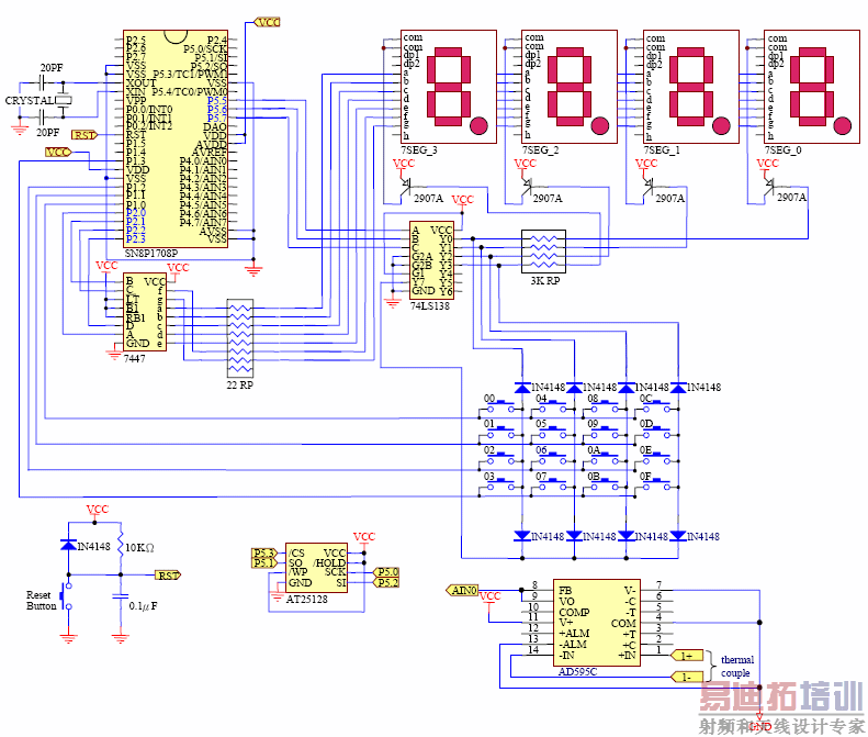 测试的电路板依照图2 的电路图制作,其中AD595C 和AT25128 二颗芯片的照片如图4 所示。程序的撰写依照前述的方法,只有模拟转数字ADC 未介绍,这部分请参考e 科技杂志vol. 28, April 2003, p. 18~21 中林锡宽所著的『电动滑板车速度控制器』。