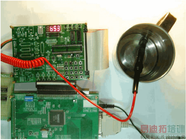 实际测试是将热电偶置于热水中来进行(见图5),当按下『C』键后,可以看到四颗四段显示器显示653 的数值,即表示目前输入电压为5 × (653 / 4096)= 0.798 V,因为ADC 参考电源为5 V,而分辨率为12 位。整个过程结束后,则显示AAAA。同样的,以市售的热电偶温度计量测,得到80°C。如果以AD595的电压温度关系,直接成上100 就是温度,也可以得0.798 x 100 =79.8°C。二者的结果非常吻合。