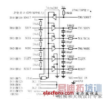 通过下载电缆实现上述过程的原理图如图3所示。需要特别注意的是:图中ispEN信号与地之间必须加入0.01μF的滤波电容,而且该电容与ISPEN脚的距离越近越好。这是因为在下载程序期间,is-pEN信号为低电平有效,这样就很容易受干扰而淹没本身很弱的有效信号。