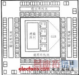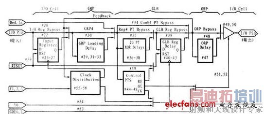 isp1032E的内部时序模型如图2所示。其中GOE0、GOE1为所有I/O单元的输出使能管脚。该管脚也可作为专用输入管脚来用。外部专用时钟输入管脚Y0与所有GLB单元的一个时钟输入脚相连;Y1进入时钟分配网络后可选择控制任何一个GLB单元的时钟输入;Y2进入时钟分配网络后可选择与任何一个GLB单元或I/O单元相连;Y3进入时钟分配网络后可选择与任何一个I/O单元相连。RESETj键可用于将所有的GLB单元或I/O寄存器单元复位。