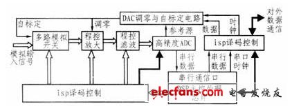 现代测试系统的一个共同特点是高速、高精度和多参数综合测试。在背板式发动机参数综合测试系统中,应变、压阻、热电阻传感器以及热电耦信号的调理输出都需要做高精度的采集与处理。为实现高精度的性能指标,充分发挥DSP速度快,运算功能强大的优势,笔者设计了以DSP为核心的处理器、以isp译码控制电路为核心的控制单元和多路模拟开关选择电路、程控放大电路以及程控模拟滤波电路、高精度ADC模数转换电路、DAC调零与自标定电路等组成的高精度数据采集板。该测试系统对内可以实现高精度的数据采集,对外可以通过isp译码控制经仪器总线与其它仪器板卡或互联设备进行数据通信。