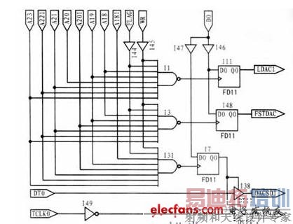 DAC调零与自标定电路部分的isp译码控制电路(原理图方式)如图6所示。在该程序成功烧录到isp芯片后,可以通过isp地址译码来控制DAC(DAC7614)串行输入数据和输入时钟的开或关,并根据该DAC的工作特性输出所需的、用于调零与自标定的模拟电压值。